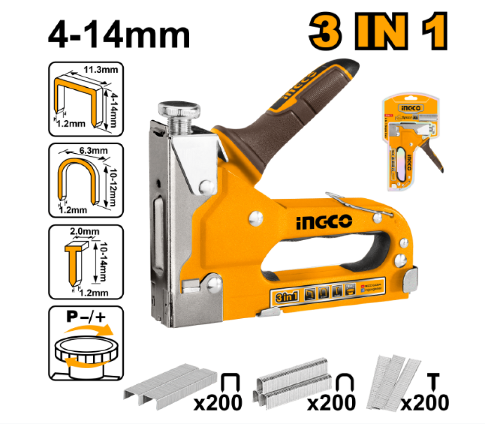 مكبس تنجيد يدوي 3 في 1 + طقم دبابيسمكبس تنجيد يدوي عملي متعدد الاستخدامات 3 في 1، مثالي لأعمال التنجيد، والنجارة، وتثبيت القماش، والديكور. يأتي مع طقم مكون من 200 دبوس قياسي، 200 دبوس على شكل U، و200 مسمار تثبيت (براد) لتلبية جميع احتياجات التثبيت لديك.