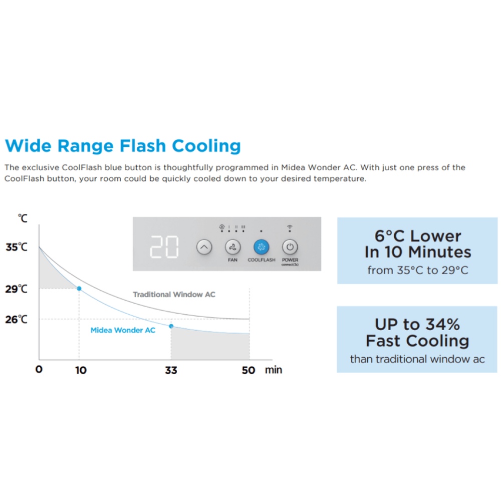 - تبريد قوي و سريع: استمتع بتوزيع أكبر للهواء بنسبة 63% ومستوى ضجيج أقل بمقدار 4 مرات من مكيف الشباك العادي! وتبريد أقوى و أسرع بمقدار 34% ! بالإضافة للإنفرتر الموفر للطاقة أكثر بنسبة 26% مع إمكانية التحكم في المكيف عن بعد من خلال الواي فاي.
