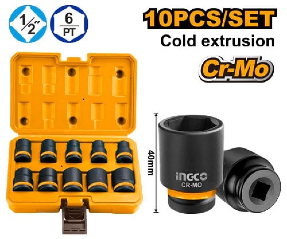 Professional 10-piece impact socket set designed for air impact wrenches. Made of high-strength Cr-Mo steel with heat treatment for durability and resistance to wear. Ideal for automotive and industrial applications. Comes in a durable plastic storage case for easy organization and portability.