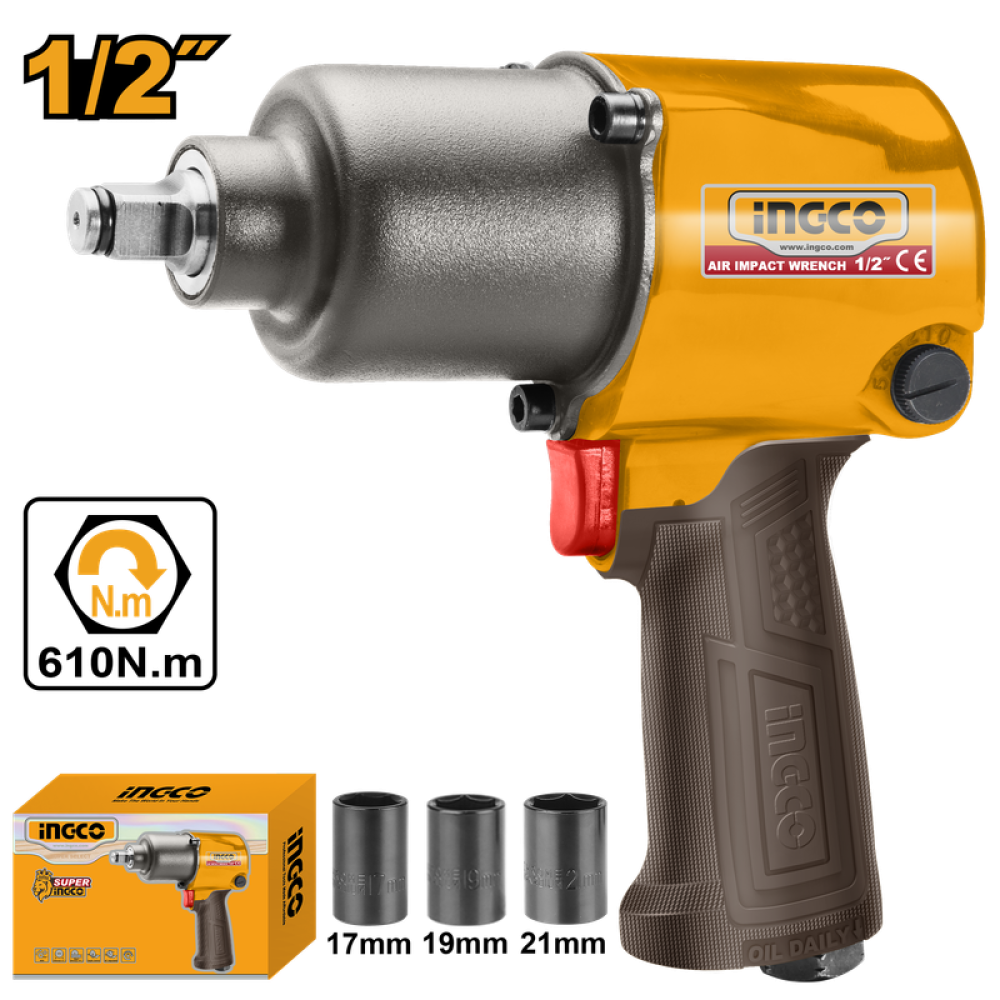 The Air Impact Wrench 1/2" features a Twin Hammer mechanism for powerful and consistent performance, delivering up to 610 Nm (450 Ft-lb) of maximum torque with a no-load speed of 7000 RPM. Ideal for automotive repair, tire service, and industrial applications.