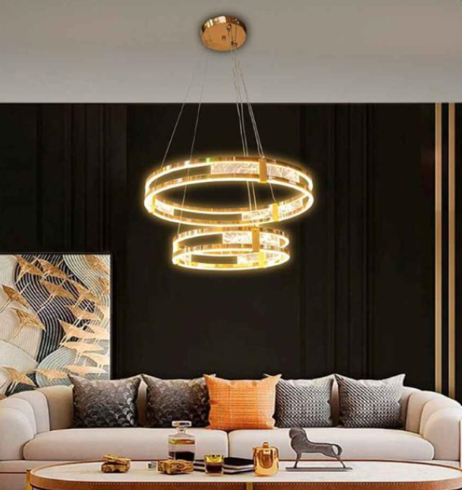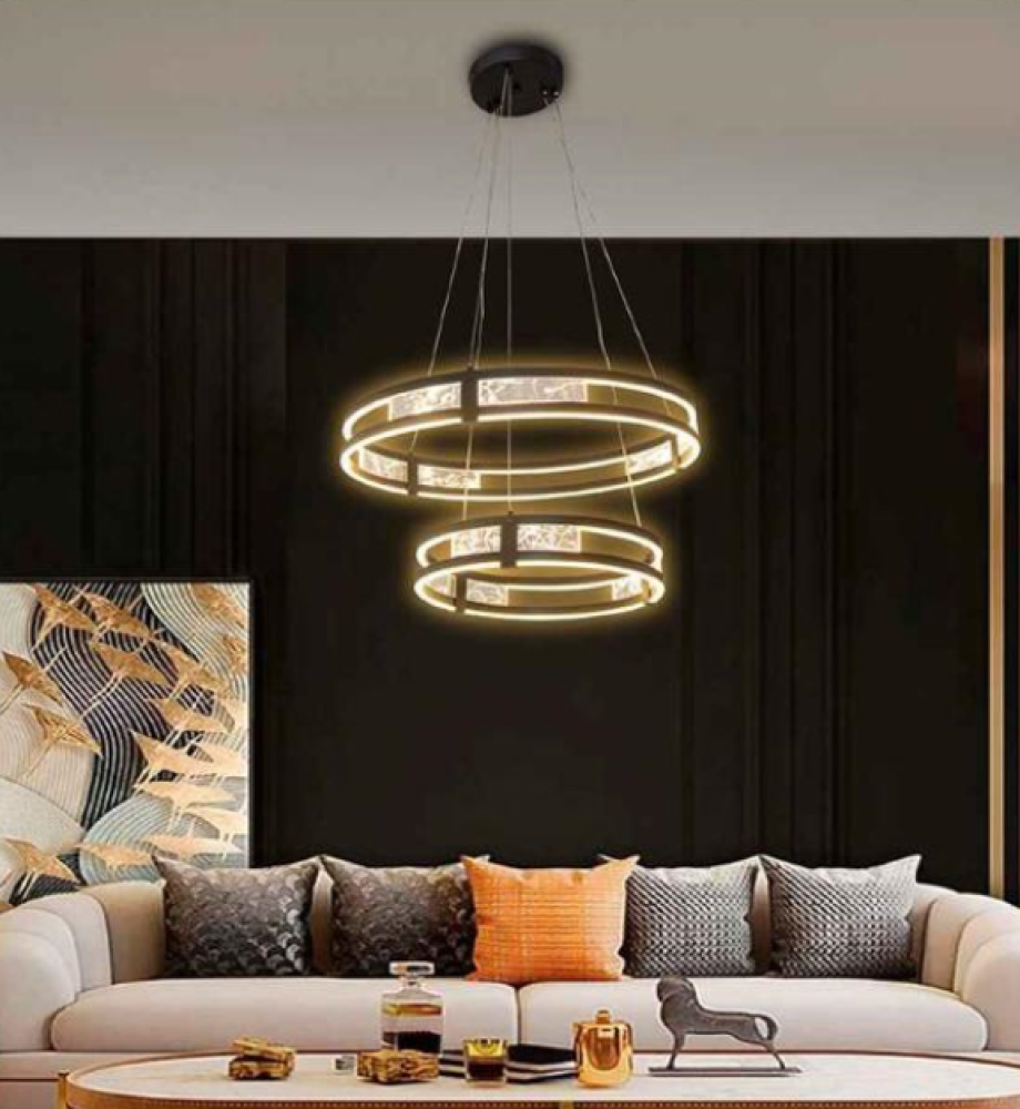 A modern chandelier with an elegant circular dual-ring design, powered at 240W. It features advanced LED lighting that provides bright, soft, and evenly distributed illumination. Built with high-quality materials and a sturdy ceiling base, with adjustable suspension wires to achieve the perfect height. Available in two color options to suit various interior styles, making it ideal for living rooms, dining areas, and modern halls.